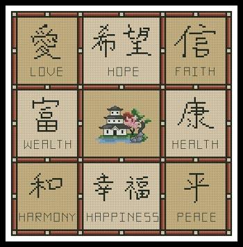 This counted cross stitch pattern of an Asian Symbols Sampler was designed by Artecy Cross Stitch. Stitch the whole design as a sampler or use the individual designs on ornaments, greeting cards etc. Full cross stitches, Quarter Stitches and Backstitching are used in this pattern.