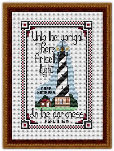 Stitch this inspirational pattern with the Cape Hatteras Lighthouse and a Bible Verse. This chart is done in colored squares with symbols, for easier stitching. The design uses whole stitches, quarter stitches, back stitching, and French knots. There are instructions on the back cover on how to complete each of these stitches. Bible Verse: Unto the upright there ariseth light in the darkness. Psalm 112:4a King James Version ( KJV )