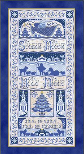 A traditional blue and white sampler to celebrate the birth of Christ. This design uses DMC floss, Kreinik #4 Briad, and Mill Hill Beads