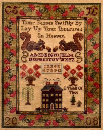 Designed to give to a special friend, this sampler is sure to be cherished. Specialty stitches sewn with hand over-dyed threads on tea-dyed linen lend an antique look. A monogram alphabet and numerals are included for personalization, as well as complete stitching instructions.