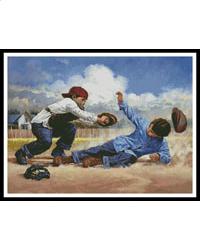 This counted cross stitch pattern of a Baseball game was created from the beautiful Artwork of Jim Daly. Image copyright of Jim Daly. All Rights Reserved. Licensed by The Ansada Group, LLC., Sarasota, Florida. Only full cross stitches are used in this pattern. It is a black and white symbol pattern.