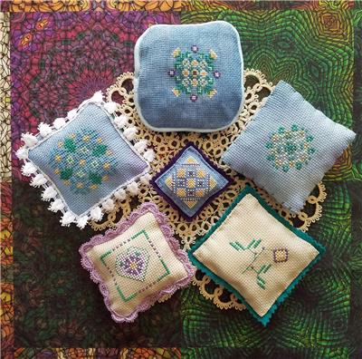Each small stitches up at about 30w x 30h, some a wee bit smaller. Finish them in a variety of ways. Perfect for ornaments, smalls to fill a decorative bowl, scissors fobs, pincushions, gift tags, or stitch them on perforated paper for greeting cards. Pick two to create unique miniature biscornu, or create special pillows and quilts for doll houses.