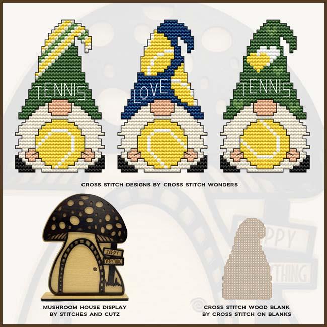 A stitched little gnome in either 14ct or 16ct fits nicely in the mushroom house doorway.