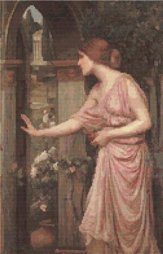 Stitch this elegant cross stitch pattern of Psyche Entering Cupid’s Garden by John William Waterhouse. With soft textures and a serene setting, this design is perfect for advanced stitchers drawn to mythology, beauty, and romance.