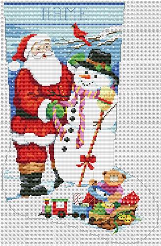 Santa and Snowman Stocking Our wintery and fun Santa and Snowman Christmas Stocking in counted cross stitch will be a favorite for kids and adults alike in your décor. Features Santa giving a scarf to an adorable snowman. Perfect for a mantel in a snowy climate. Santa's bag of toys lying in the snow while a cardinal is watching. You'll love this wintery scene full of beautiful colors and details!