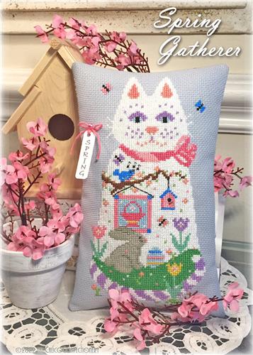In Seasonal Cats #4, we have "Spring Gatherer." Stitch this pretty white cat, with her bluebird, butterflies, and blooms. Large, easy to read, black/white symbol chart.