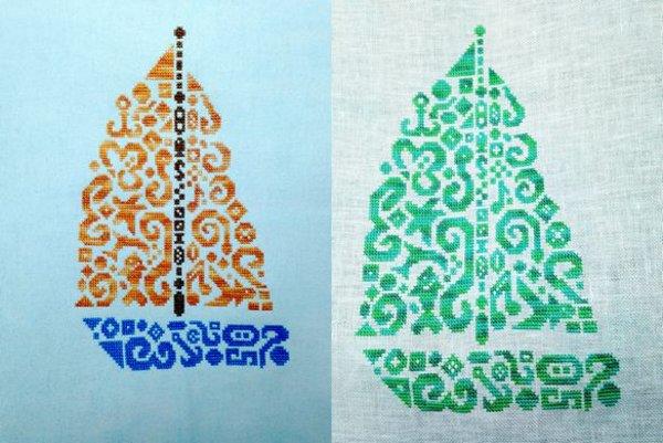 Tribal Sailboat can be stitched in multiple colors or just as a monochrome chart. The monochrome version is stitched on Cashel Blue Pearl by Fabtastic Hand Dyed Fabrics using ThreadworX Mystique. The multi-colored model is stitched on Belfast Alluring Blue by Wichelt using DMC Color Variations V4000, V4022 and V4124.