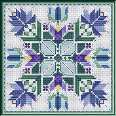 Design inspired by applique quilting Finished stitch count 167w x 167h. All full stitches with back stitch detail. Charted with 13 DMC colors.