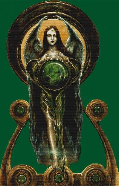 Watcher II is based on the artwork of Julien Hatswell. This angel chart is designed to be stitched in full stitches on any fabric count. 28ct Hunger Green evenwave was used in the model.